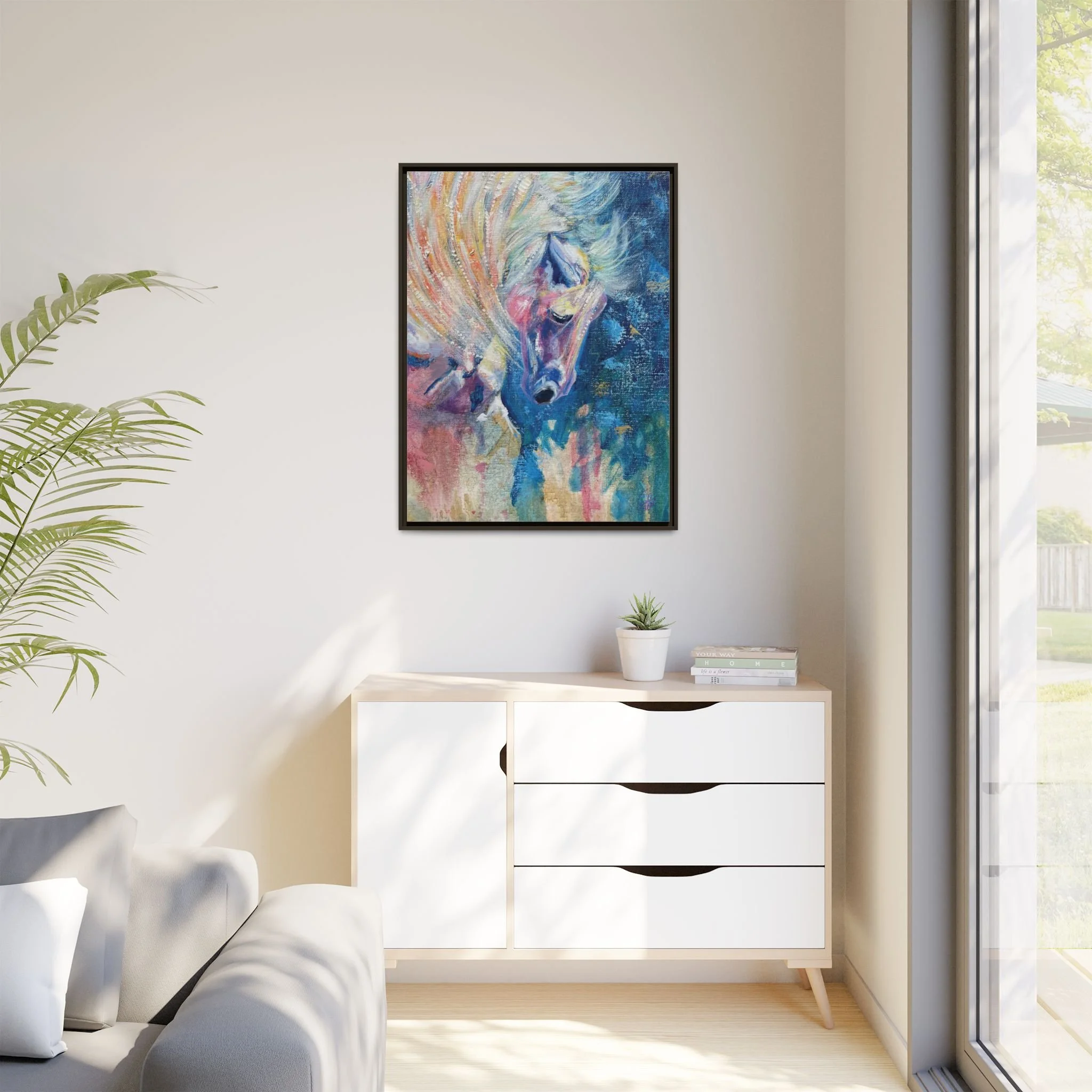 Dancing in the Wind captures the graceful strength of a horse moving through sweeping currents of color and motion. The brushstrokes flow like wind across the canvas, creating the feeling that the entire scene is alive with movement.