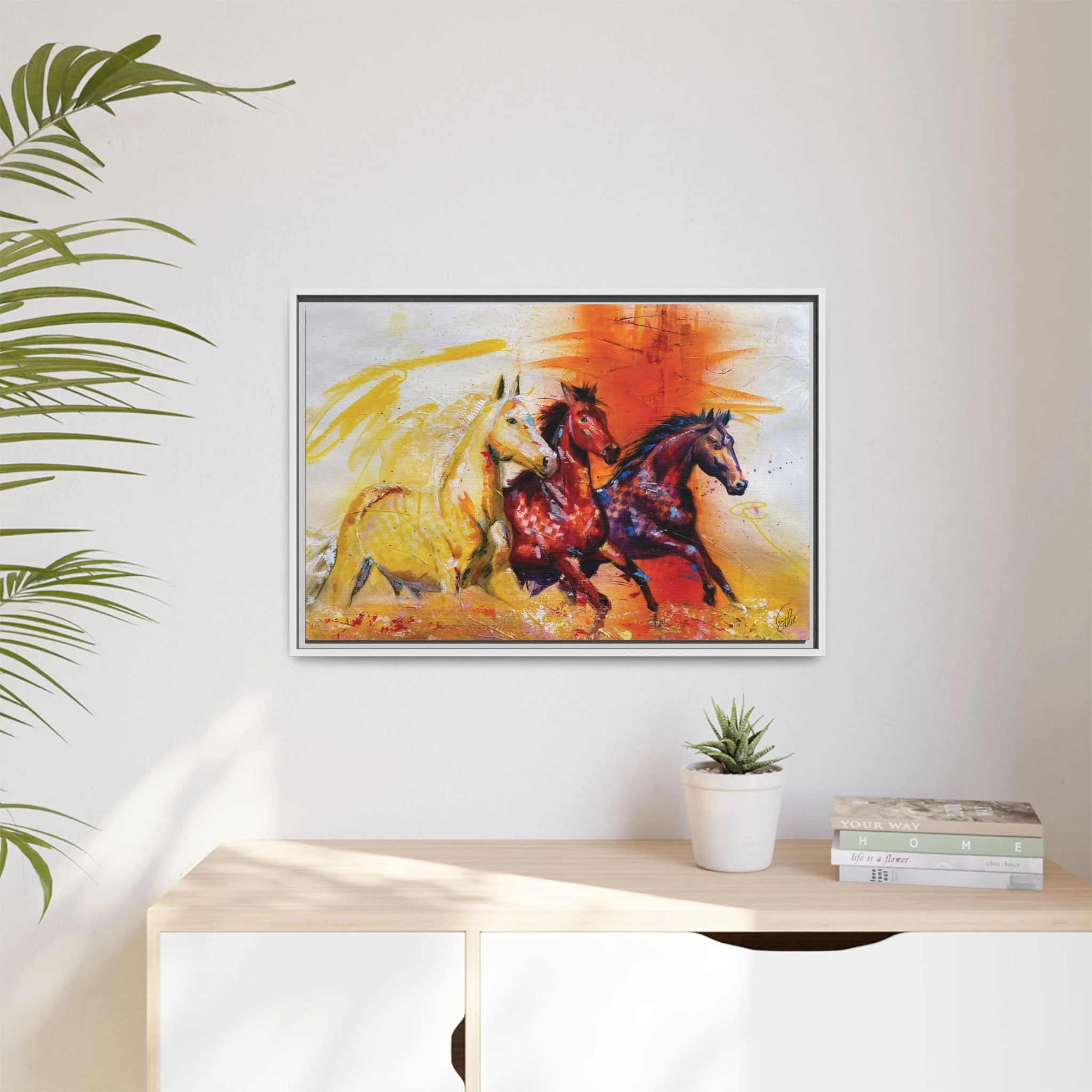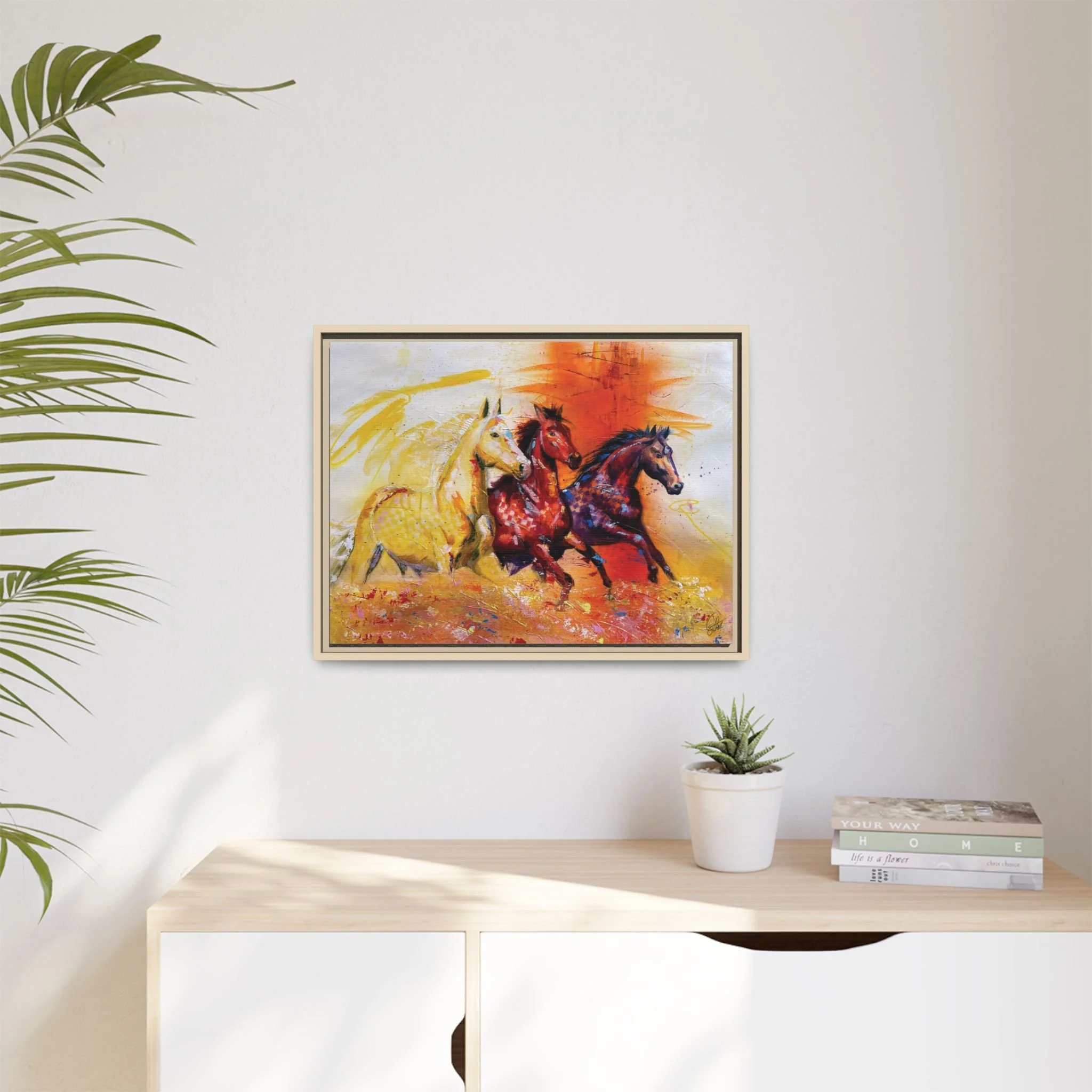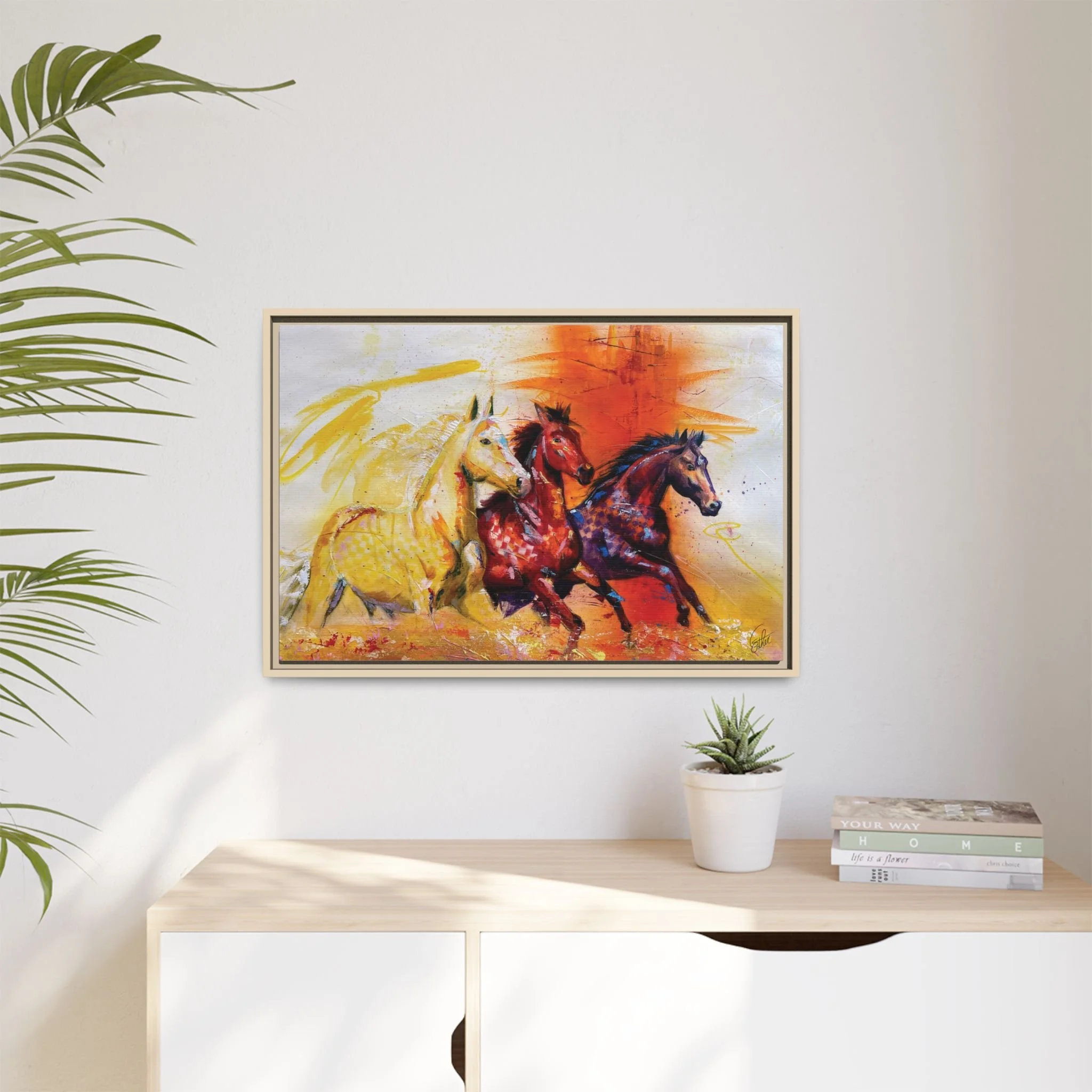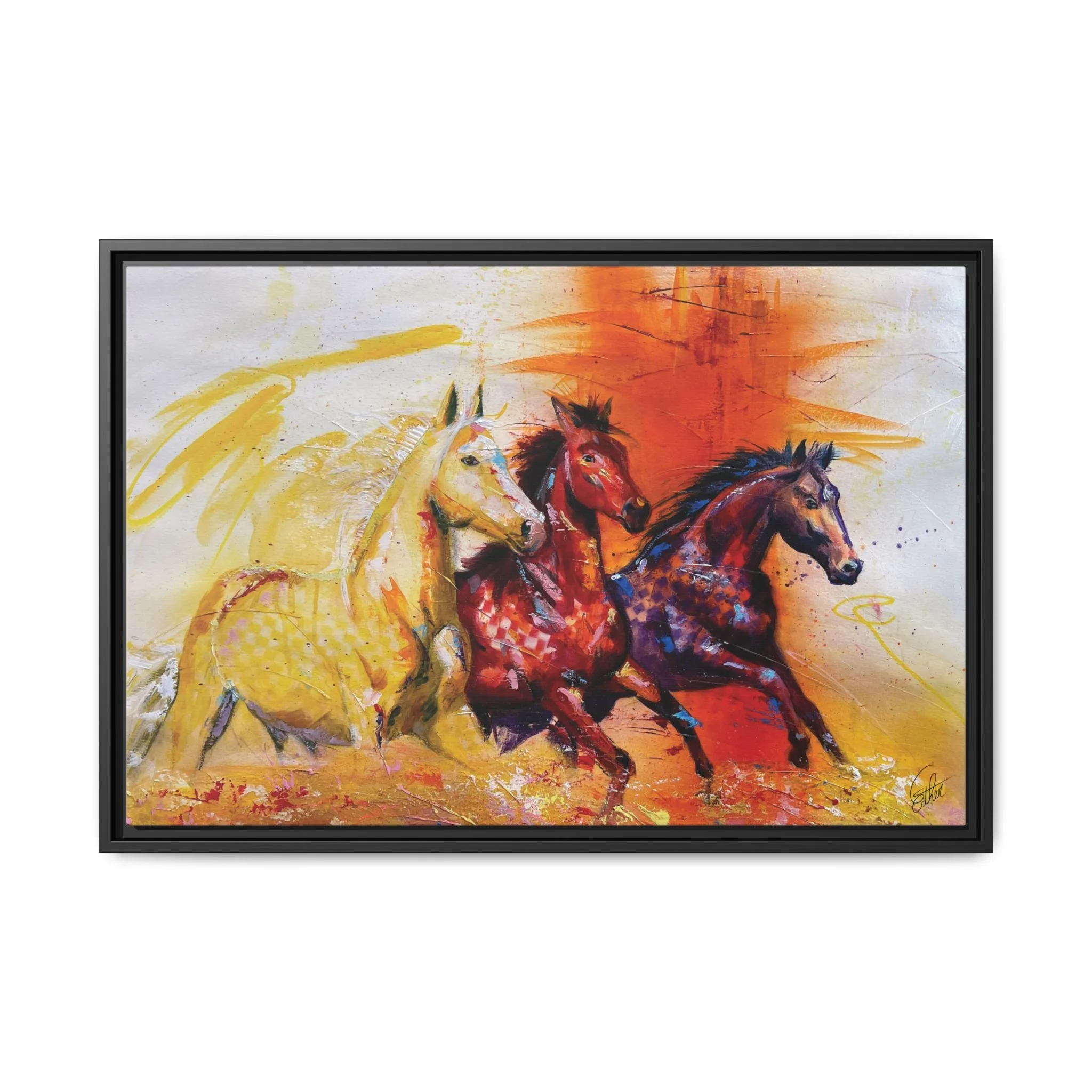 Fire Horse captures the raw intensity of power unleashed. Three horses charge forward through a storm of flame and radiant color, their movement breaking across the canvas with unstoppable force.