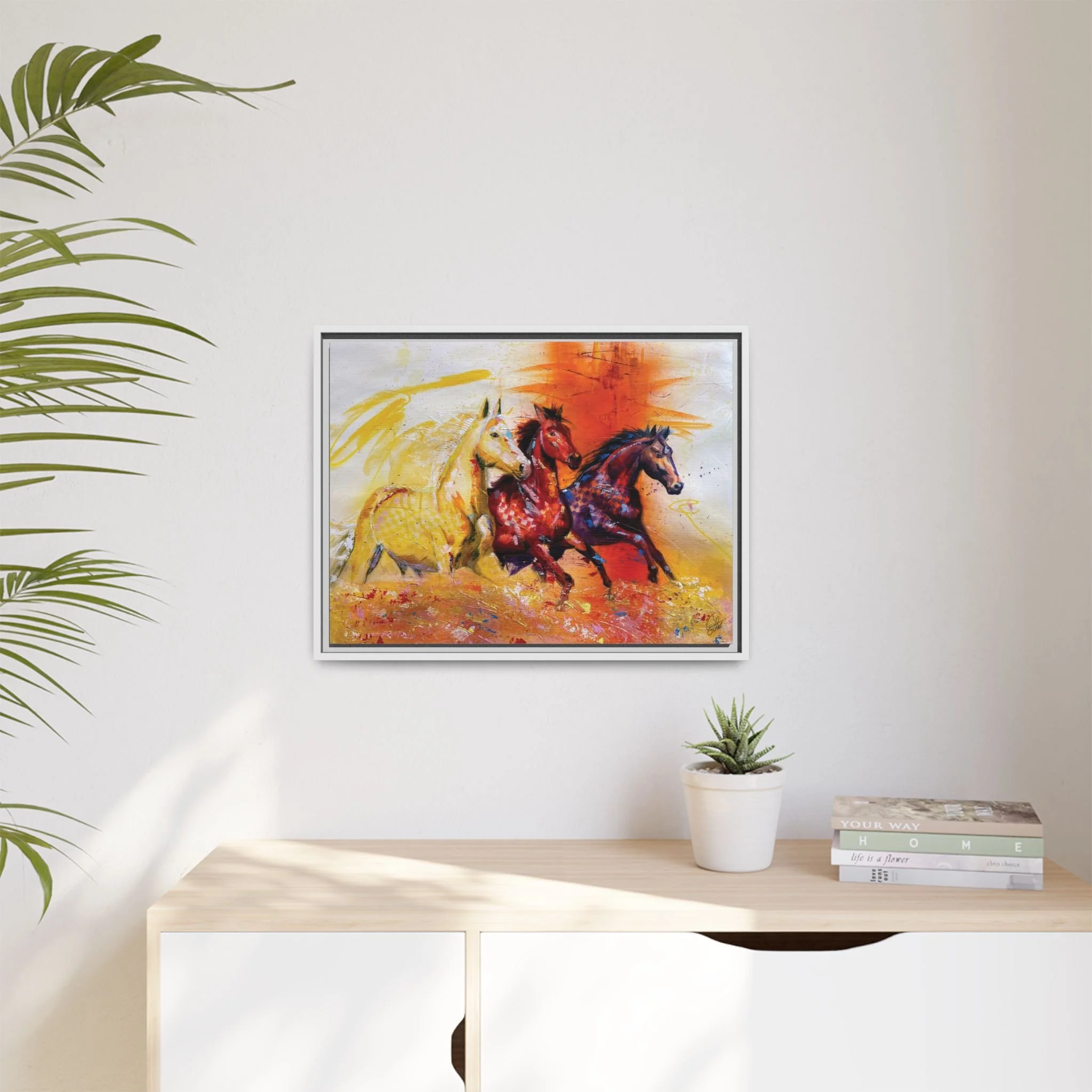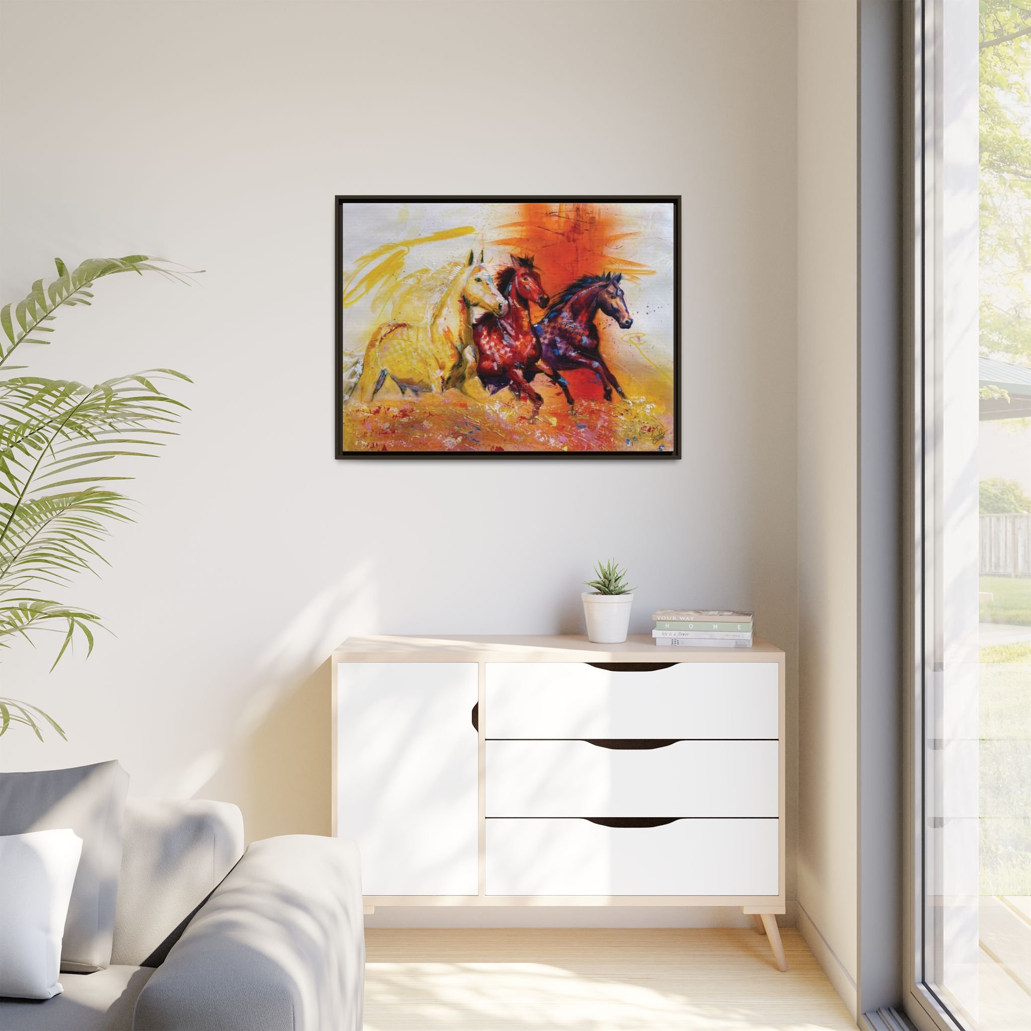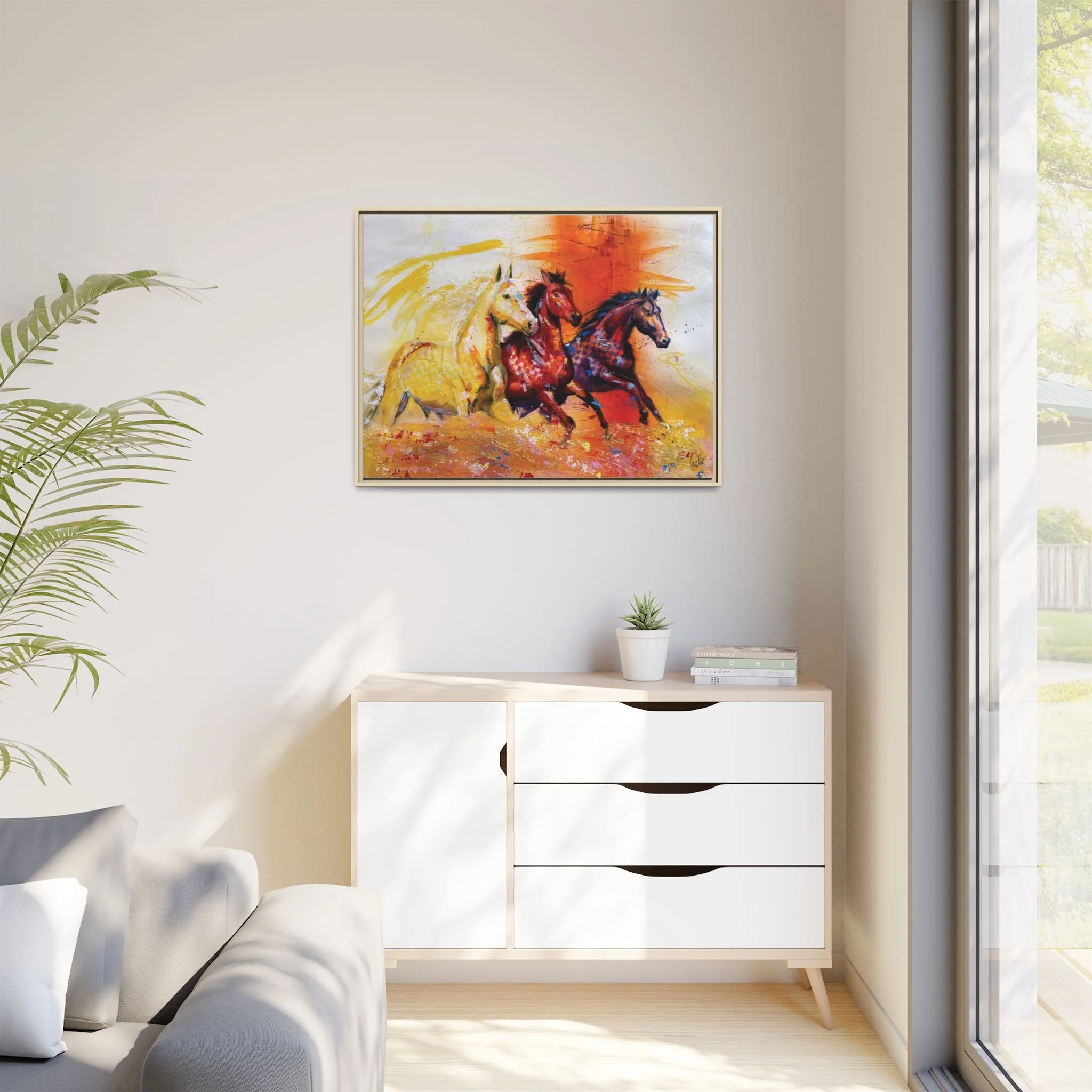 Fire Horse captures the raw intensity of power unleashed. Three horses charge forward through a storm of flame and radiant color, their movement breaking across the canvas with unstoppable force.