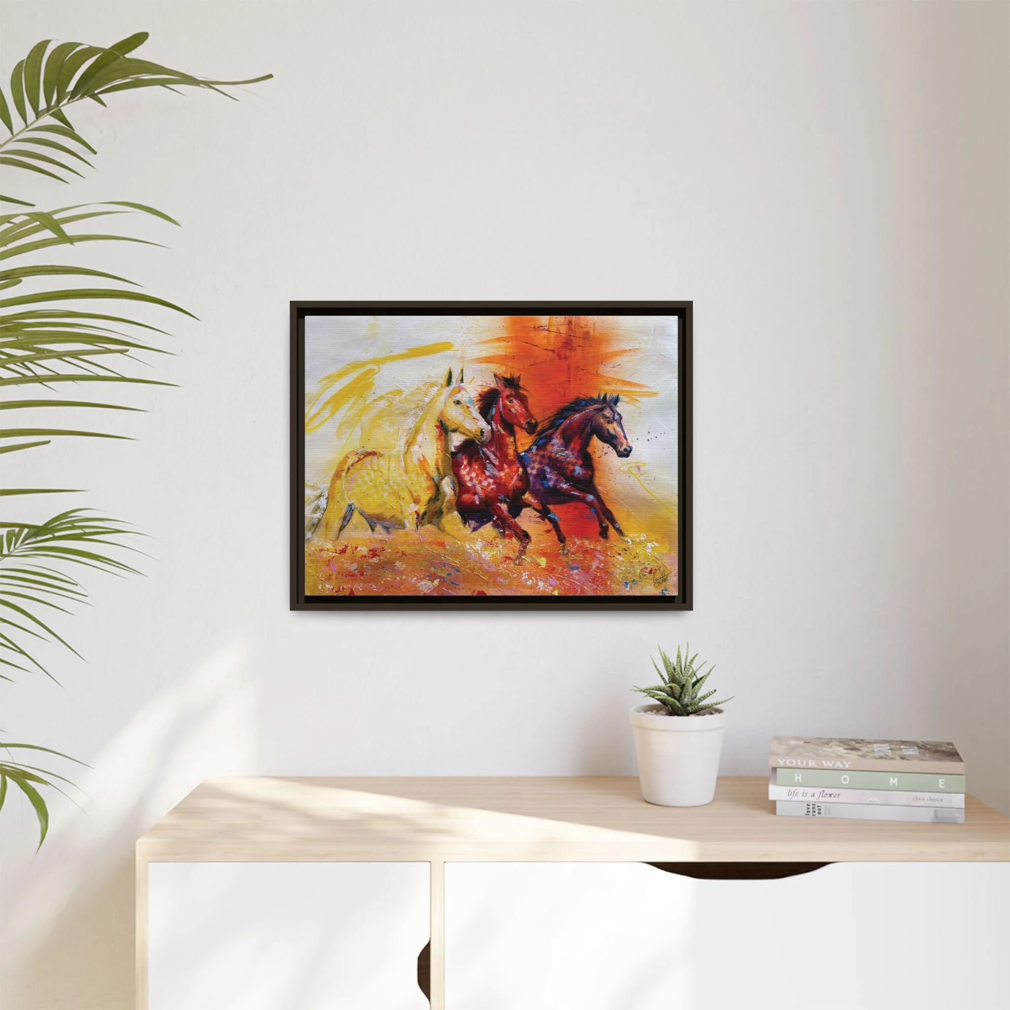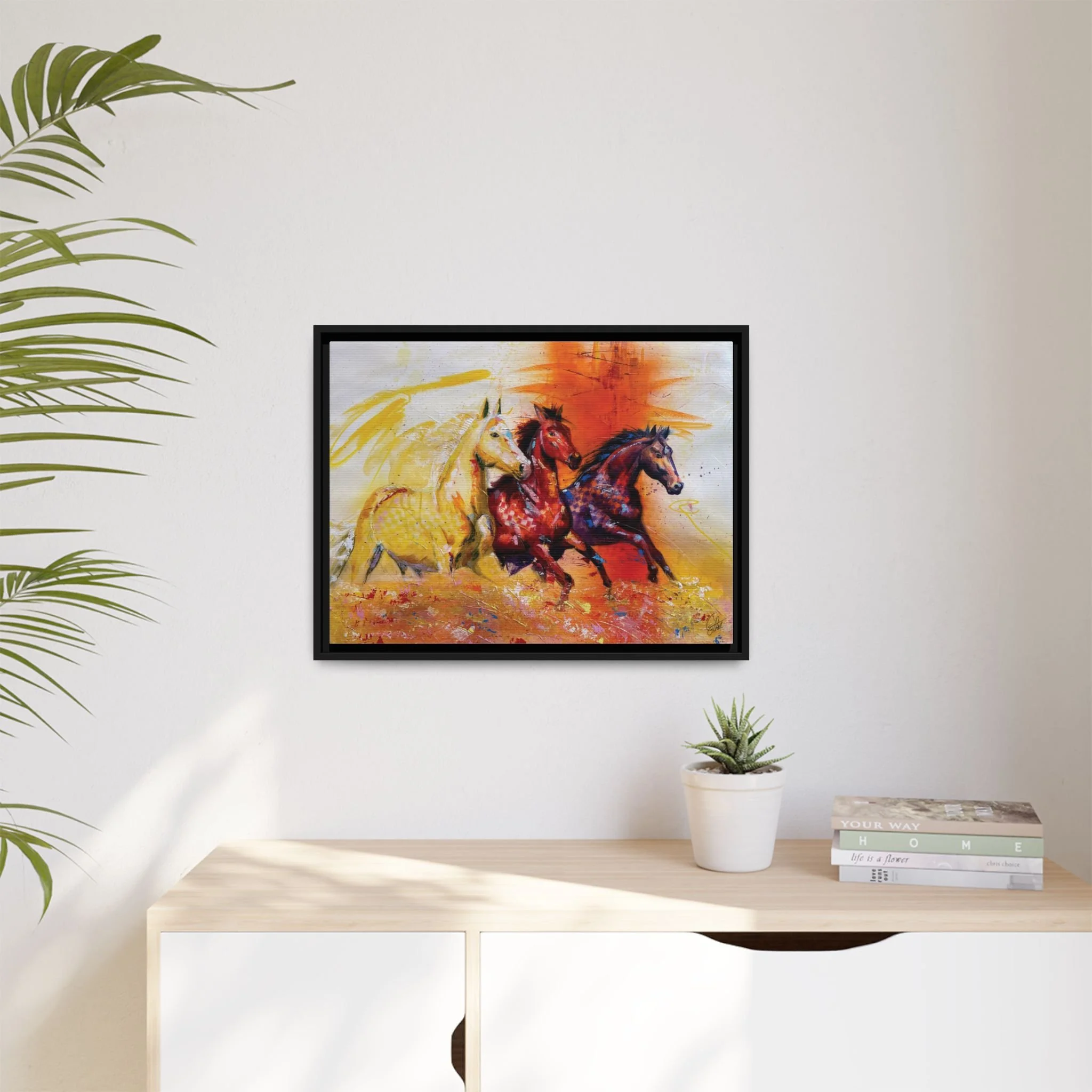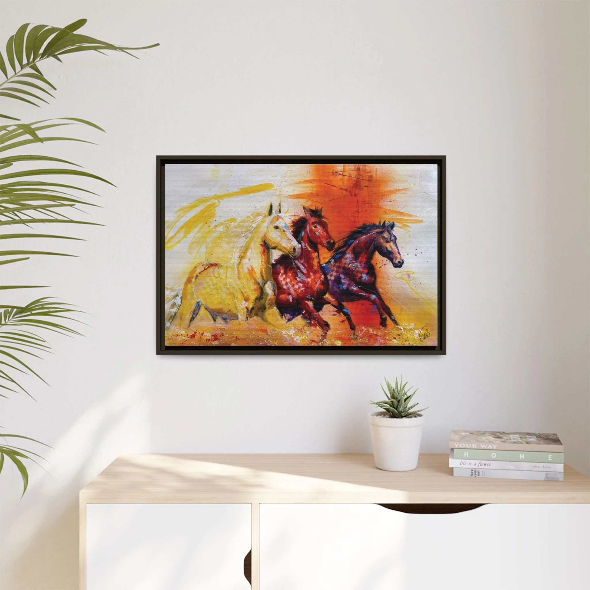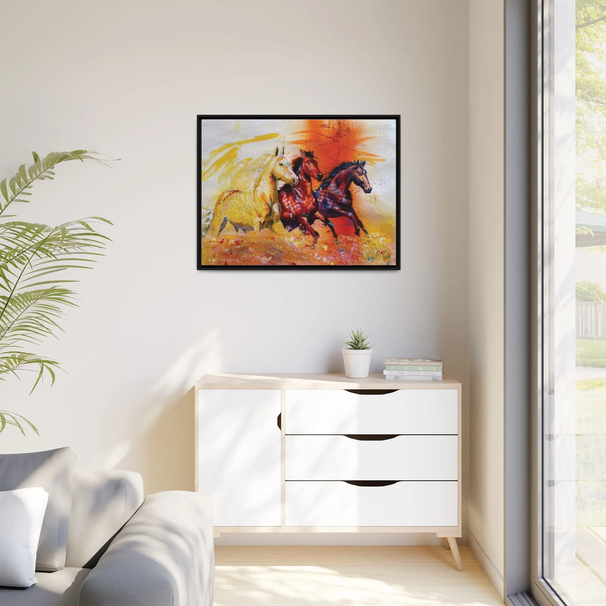 Fire Horse captures the raw intensity of power unleashed. Three horses charge forward through a storm of flame and radiant color, their movement breaking across the canvas with unstoppable force.